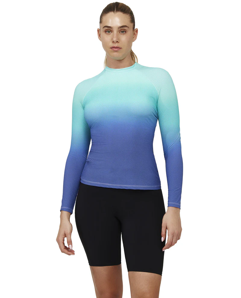 Make waves in style with the Nixie Long Sleeve Rash Guard Swim Top, your go-to for bold sun protection with a splash of flair. Featuring a built-in sports bra with removable soft cups and dreamy ombré colorways, this top blends performance and personality for all-day adventure.